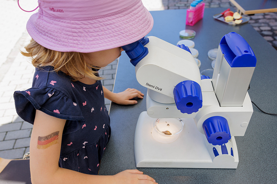 Beim Mitmachstand „Protistenparty“ lernst du, wie man mit dem Mikroskop arbeitet und entdeckst dabei Protisten, das sind Ein- oder Mehrzeller, wie Pantoffeltierchen, Euglena und Wasserflöhe, die mit bloßem Auge nicht oder nur schwer sichtbar sind. Du beobachtest diese Lebewesen gezielt und untersuchst, wie sich Einzeller fortbewegen, wie sie sich ernähren und wie sie auf Reize aus ihrer Umwelt reagieren.